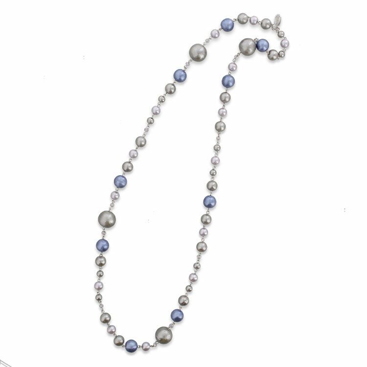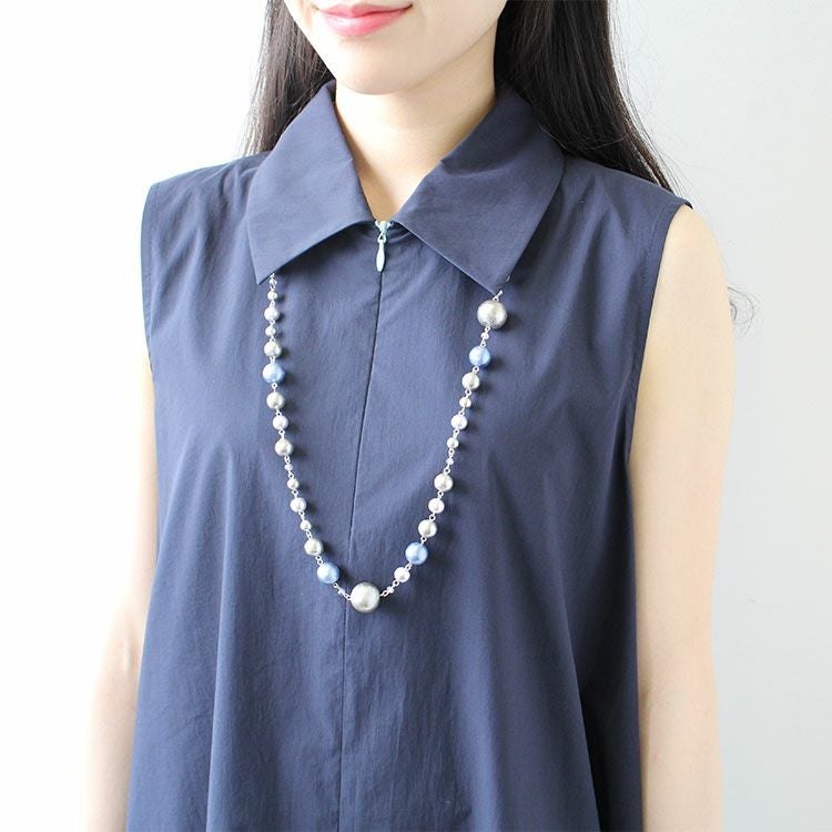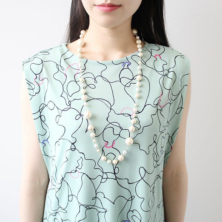 大小2色のコットンパールとクリスタルガラスのロングネックレス。