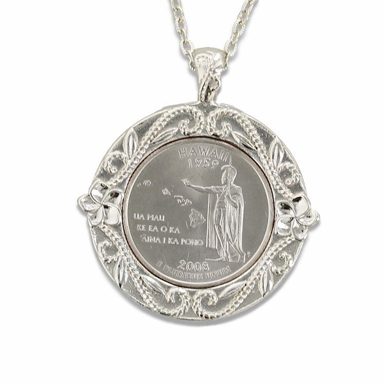 アメリカハワイ州の25セントコインを使用したネックレス。コイン周りにプルメリアのお花をあしらい、ハワイらしく仕上げました。 本物のコインをアクセサリーとして加工したものなので、コインの年号は異なります。