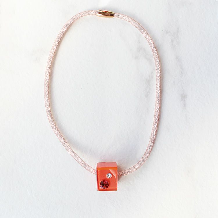 陰影のある印象的なカラーを艶やかなクリアレジンで包み込み、カラーの異なる大粒のクリスタルガラスを両面に配したトップパーツのネックレス。