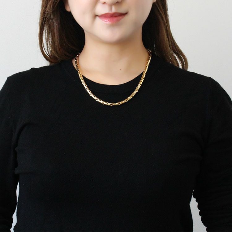 ゴールドカラーのメタルチェーンショートネックレス。ヨーロッパのチェーンメーカーがデザインしたシンプルながらも個性豊かなチェーンは単体でも重ね付けやセット使いでもおしゃれ。合わせやすいので使い勝手も抜群です。