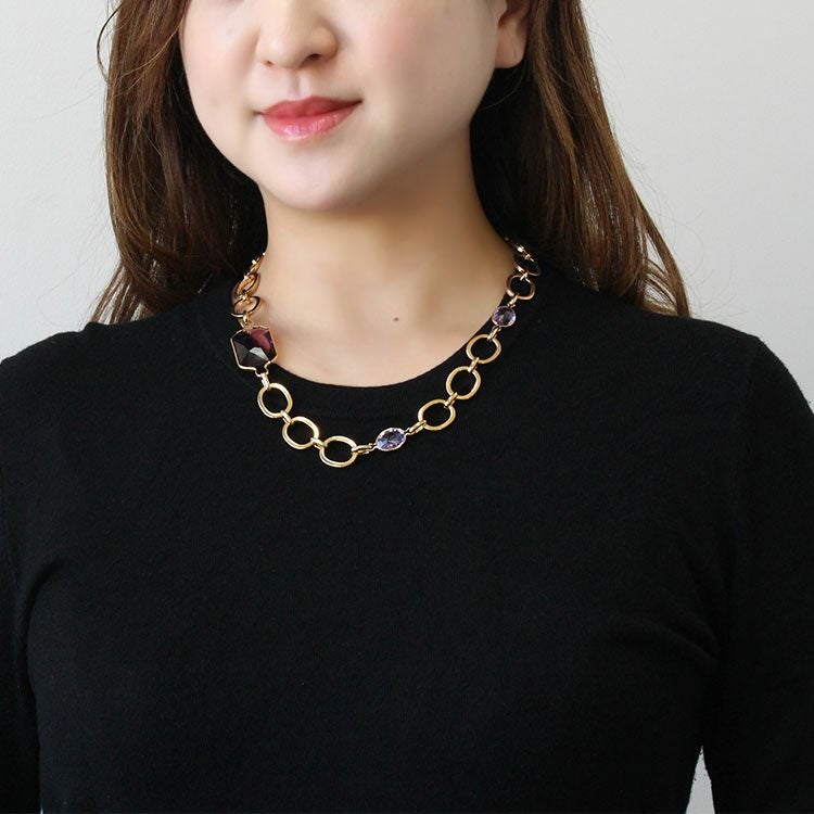 ヨーロッパのチェーンメーカーが生み出す、シンプルながらもこだわりのある金色のチェーンにクリスタルガラスの大粒ビジューが煌めくショートネックレス。光に当たるたびキラキラと反射する美しいカッティングストーンが高揚感を与えてくれます。シンプルな装いに合わせたデイリー使いも、ワンピースに合わせてパーティーやクルーズ、ディナーなどおしゃれしたい日にも。
