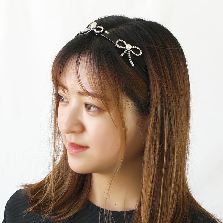 細めのカチューシャにキュートなリボンがアクセントになったリボンカチューシャ。煌めくビジューがリボンをカタチづくり大人カワイイデザインになっています。