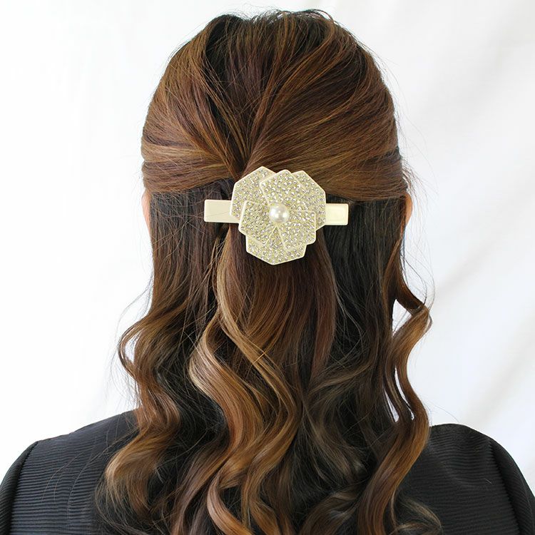 フラワーモチーフに小さなガラスストーンがキラキラ煌めくエレガントなバレッタ。中央に配置された大きなガラスパールが可愛さを引き立てています。地金はどちらもゴールドで、より華やかな印象をあたえます。