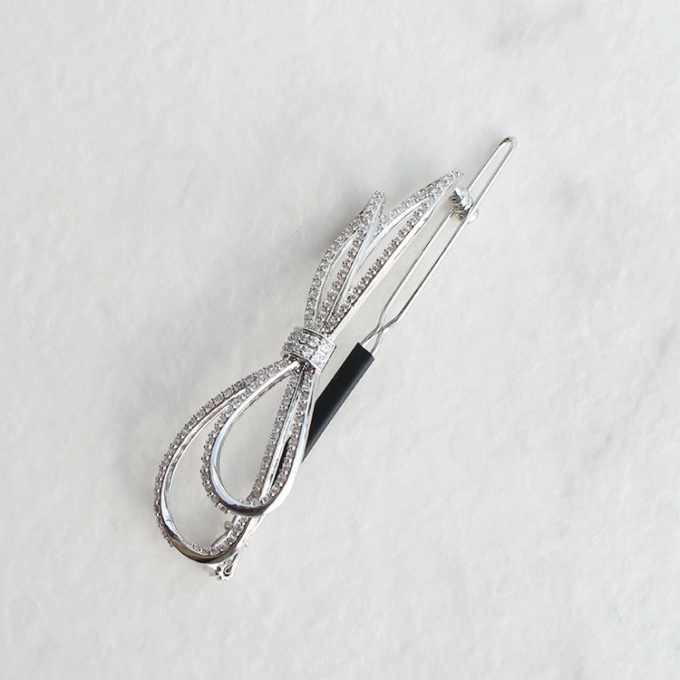 繊細で立体的なフォルムのリボンモチーフにクリアカラーのキュービックジルコニアが煌めく、髪の毛を挟むタイプのヘアピン。やや厚めに髪の毛をすくって挟むと安定します。