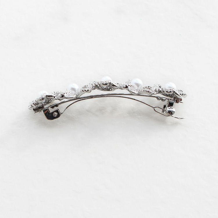 繊細なフラワーモチーフにパヴェ状のキュービックジルコニアをセッティングし、パールを組み合わせた品の良いデザインのバレッタ。華やかさはありつつ派手にならない程よい大きさなので、日常使いからお呼ばれシーンまで、幅広くお使いいただけます。