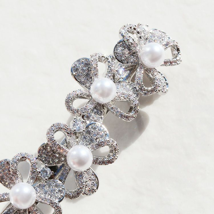 繊細なフラワーモチーフにパヴェ状のキュービックジルコニアをセッティングし、パールを組み合わせた品の良いデザインのバレッタ。華やかさはありつつ派手にならない程よい大きさなので、日常使いからお呼ばれシーンまで、幅広くお使いいただけます。