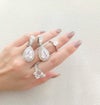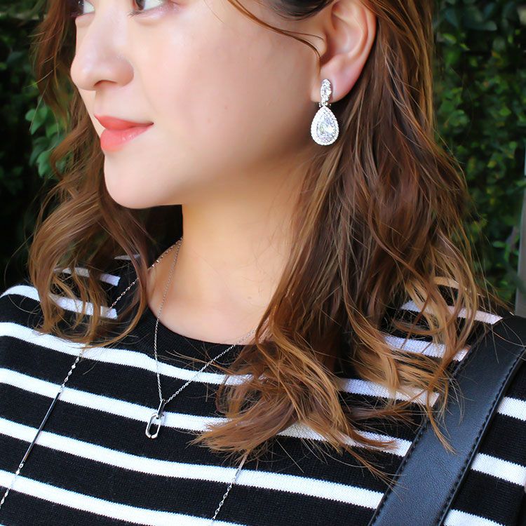 ドロップシェイプのストーンが輝くジュエリーライクなデザインのイヤリング。ジュエリーよりも気軽に着けられるので、日常使いしやすいアイテム。光に対してジュエリーよりも強く煌めくので、結婚式やステージにもおすすめです。