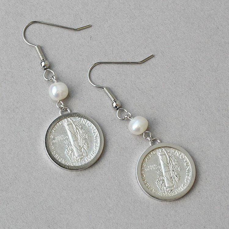 アメリカ10セントマーキュリーダイムコイン×パールロングピアス