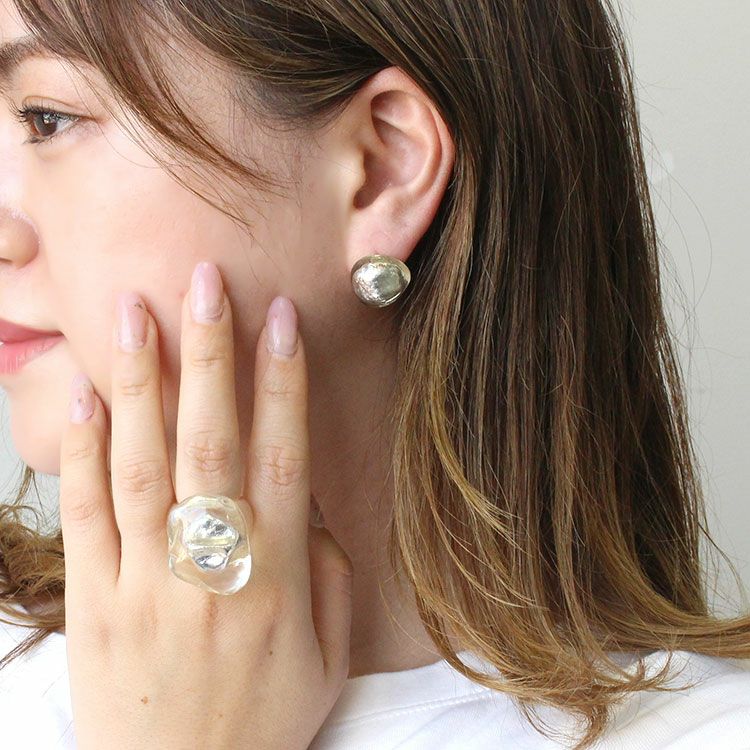 アートのような変形したフォルムがニュアンスのあるレジンピアス。キラキラと光を反射するレジンに銀箔、金箔がアクセントになって、ラグジュアリーで、モードな雰囲気を印象付けています。どの角度から見てもこなれ感あるデザインは、デイリー使いはもちろん、パーティーシーンにもおすすめです。