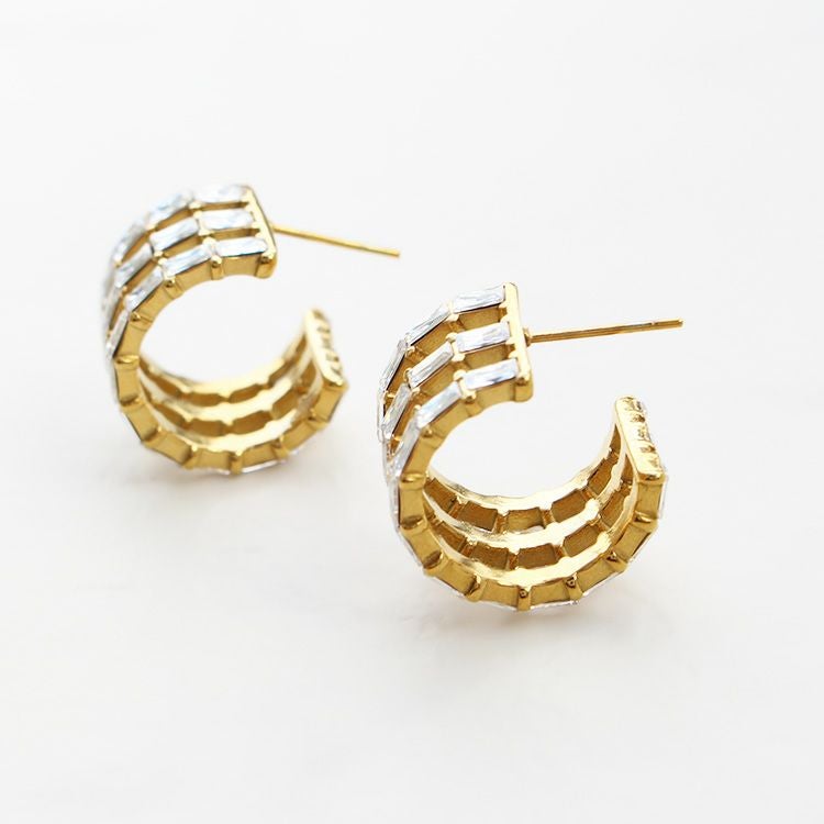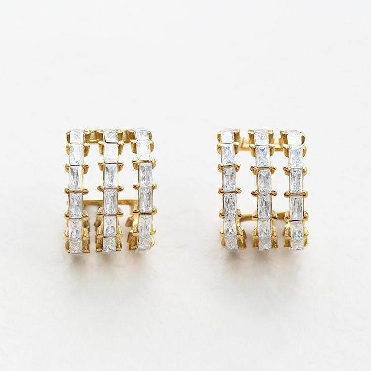 レクタングルキュービックジルコニアを連ねた、シンプルでありながらも華やかなフープピアス。流行や年代にとらわれずに使いやすいデザインで、かつ合わせる洋服や使うシーンを選ばないので、持っておくと重宝するアイテム。