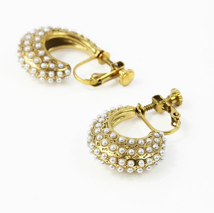 小さなパールが全面に配置されたハーフフープイヤリング。 おしゃれで華やかなデザインは、女子会やお買い物などのデイリー使いから、パーティーシーンまで幅広くご利用いただけます。ステンレス素材を使用しているので変色しづらく季節を問わずつけやすいのが特徴です。