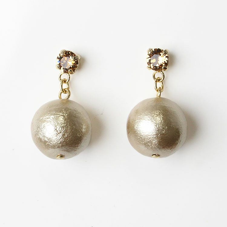 やさしげな肌触りと独特の風合いが魅力の、コットンパールのデザインピアス。ビジューがついた華やかなデザインは、パーティーからデイリーまで幅広くご使用いただけます。