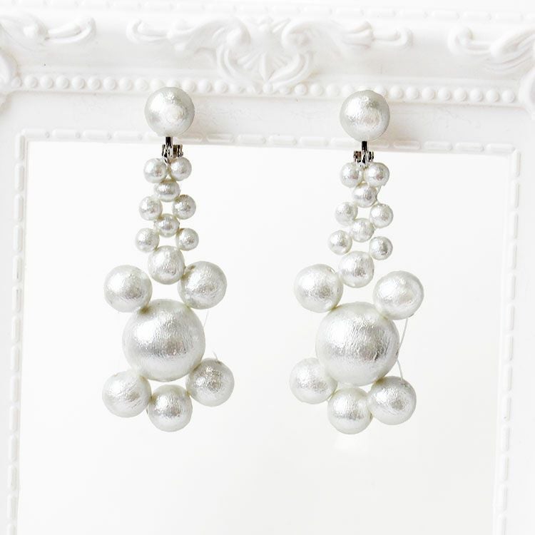 やさしげな肌触りと独特の風合いが魅力の、コットンパールのロングイヤリング。大ぶりで華やかなデザインは、パーティーからデイリーまで幅広くご使用いただけます。