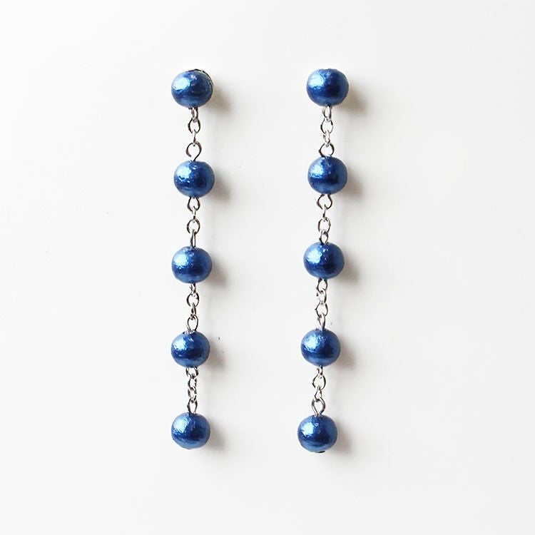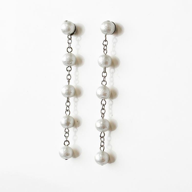 やさしげな肌触りと独特の風合いが魅力の、コットンパールのデザインロングピアス。しなやかに揺れる華やかなデザインは、パーティーからデイリーまで幅広くご使用いただけます。