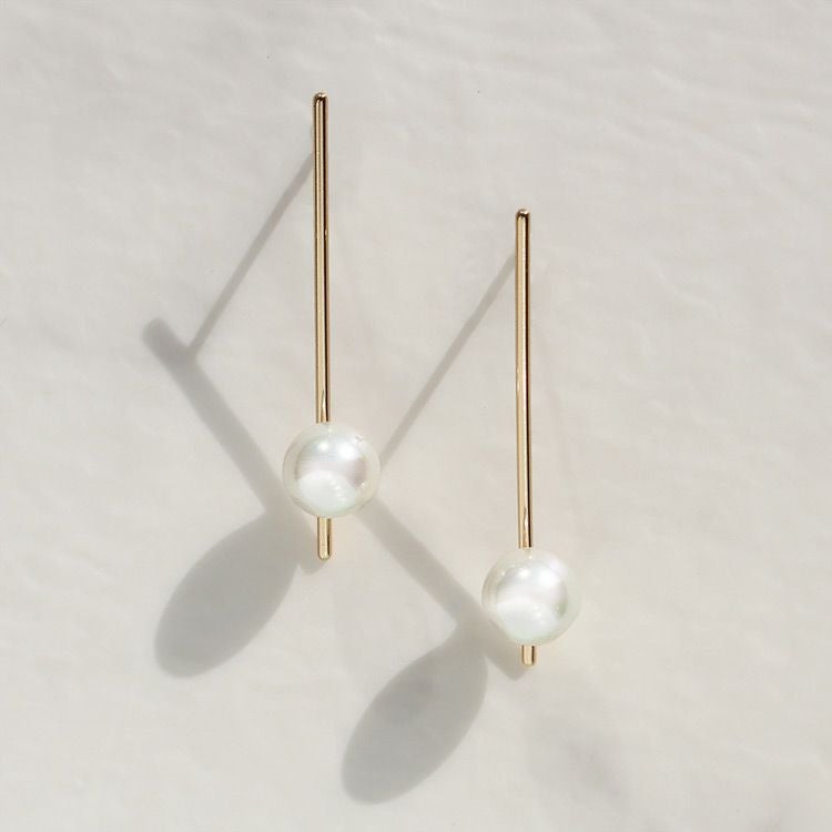 18金メッキの極細メタルバーが耳元にすっと溶け込むようなピアス。世界一の人工パールといわれるスペイン、マヨルカ島で生産されるマジョルカパールを配し、シンプルでありながらも洗練された印象に。