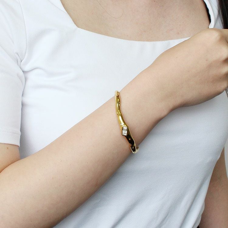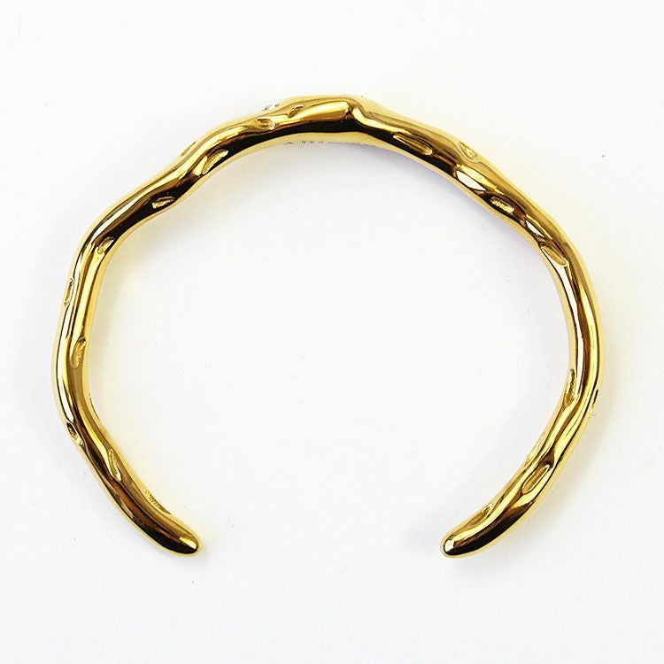 有機的なニュアンスあるバンドに大きなクリスタルガラスがあしらわれたオープンバングル。エレガントで華やかな着脱しやすいデザインです。パーティーシーンはもちろん、あえてカジュアルな装いにご使用いただくことでコーディネートを引き締め、大人カジュアルにご利用いただけます。