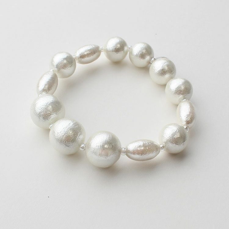 やさしげな肌触りと独特の風合いが魅力の、コットンパールのブレスレット。ゴム式のため着脱もスムーズ。パーティーからデイリーまで幅広くご使用いただけます。