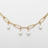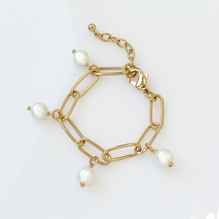線が細く大ぶりなチェーンにマヨルカ島で作られたパールを組み合わせたゴールドカラーのチェーンブレスレット。