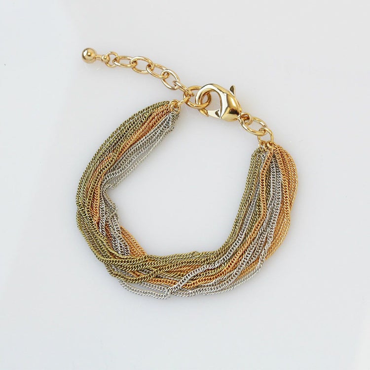 スリムなチェーンを多連にしたシンプルながらもボリューム感のあるチェーンブレスレット。複数のメッキカラーを組み合わせているので他のアクセサリーとも合わせやすく、幅広いシーンやコーディネートに使えます。
