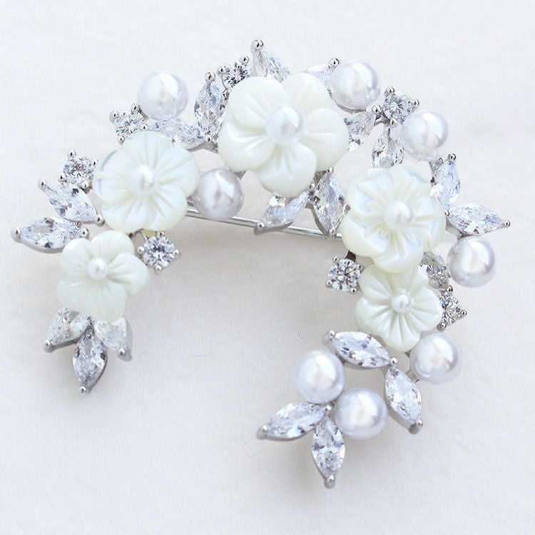 マザーオブパール(MOP)のお花に小さなパールを組み合わせたエレガントなハーフムーンブローチ。キュービックジルコニアの葉っぱが華やかで洗練された印象をプラスしてくれます。ニットやコートなどに合わせた日常使いから、セレモニーやオケージョン、パーティーシーンなど、幅広くご利用いただけます。ご自身用やギフトにもおすすめです。