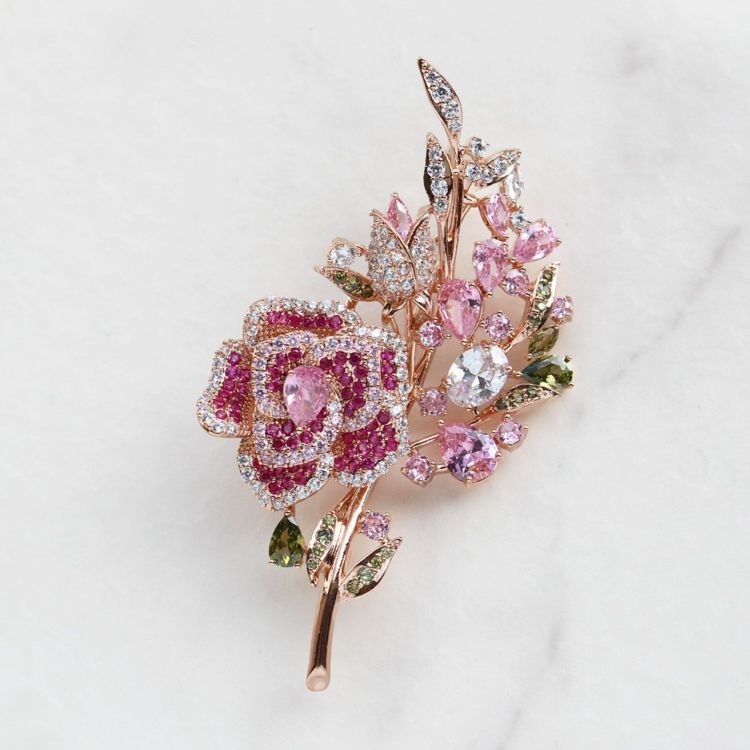 色鮮やかなキュービックジルコニアをたっぷりとあしらった華やかなバラモチーフのブローチ。大きめのサイズでコーディネートのアクセントに。ステージやパーティーにもおすすめです。