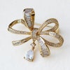 リボンを立体的に結んだようなデザインに大粒のドロップモチーフが大人かわいいリボンモチーフデザインブローチ。やや小ぶりなサイズ感で気兼ねなくつかえそう。季節を問わないデザインなのでシャツやニット、コートやストール、帽子やバッグなど、さまざまなアイテムにお使いいただけます。