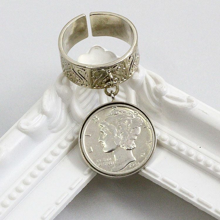 アメリカ10セントマーキュリーダイムコインをあしらったコインリング。