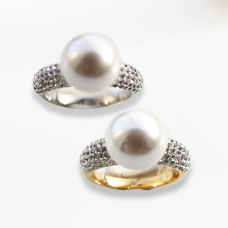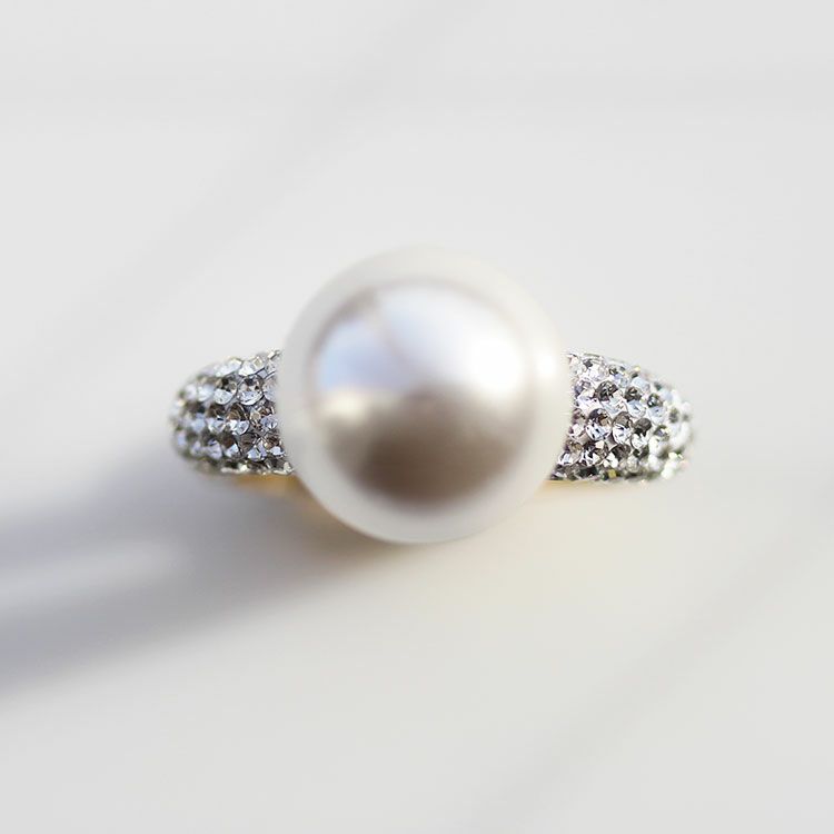 台座に大粒のパールがあしらわれているパールリング。リングにはチェコクリスタルがパヴェ状に敷き詰められ、大粒のパールがエレガントな印象をプラスし、大人の装いにしっくりとなじみます。