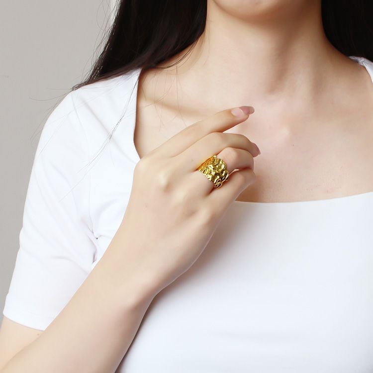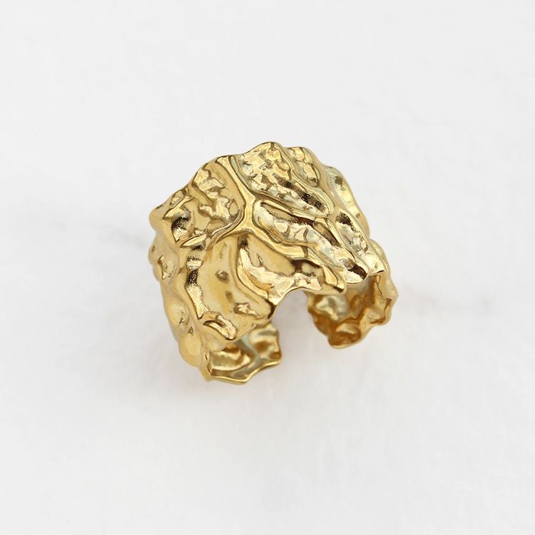 槌目加工を施した、くしゅくしゅと柔らかい布にシワを寄せたような、彫刻のような、ニュアンス感のあるリング。