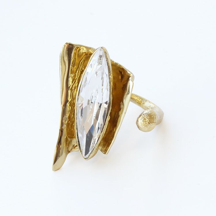 ドレープを寄せた布のような柔らかさを感じさせるメタルに、クリアカラーのクリスタルガラスを合わせたフォークタイプの大ぶりリング。主張のあるデザインとサイズ感でインパクトは抜群ながら、シンプルなカラーリングで品の良さとコーディネートのしやすさも併せ持つデザインです。カジュアルな普段着のワンポイントにも、パーティーなど着飾るシーンにもおすすめ。洗練された個性を表現したい大人の装いに。