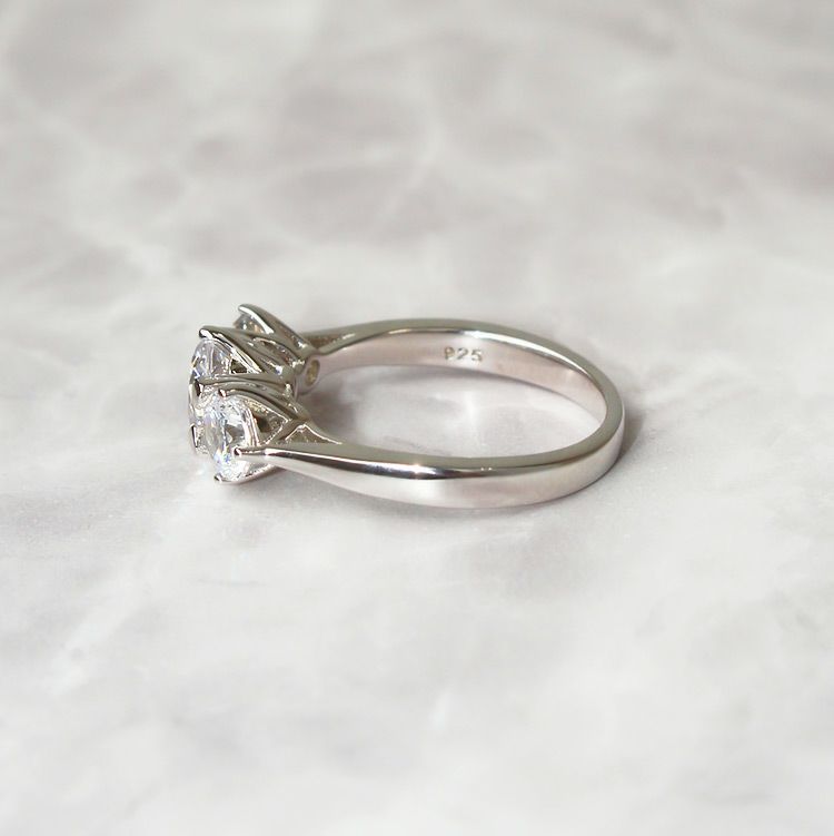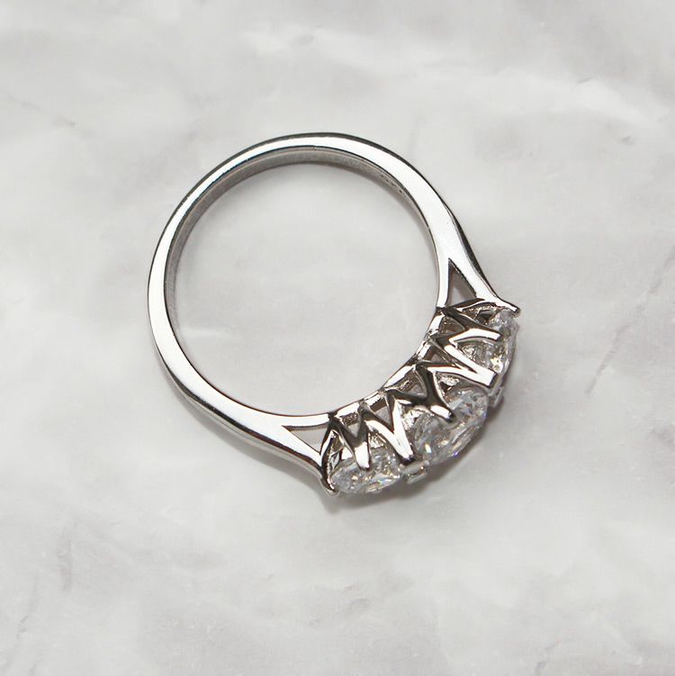 ジュエリーに用いられるダイヤモンドと同様の精巧なカットを実現した、特別なキュービックジルコニアを使用したリング。そのカット技術により、光を最大限に反射し、曇りのない美しく眩い輝きを放ちます。大ぶりなストーンを3石使用した華やかなデザイン。