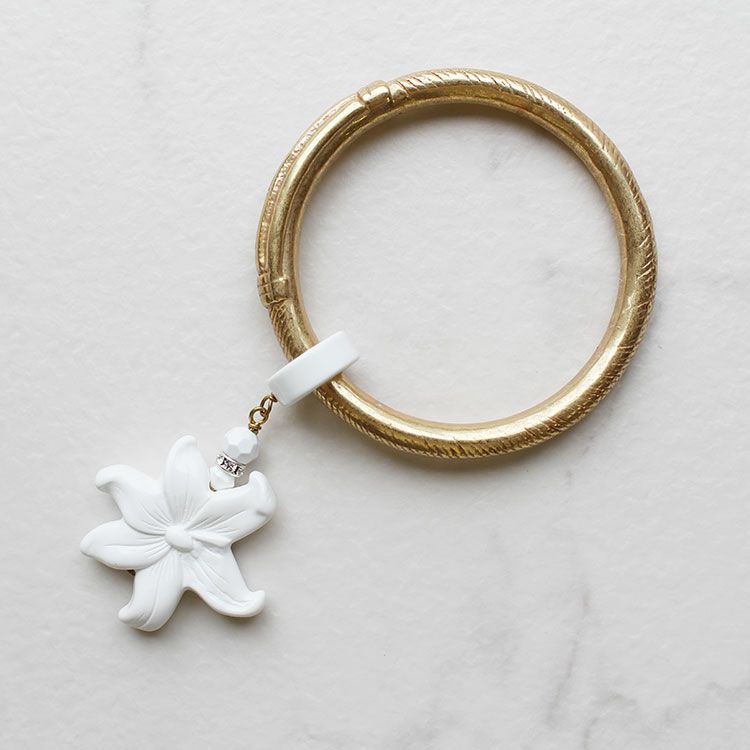 爽やかなホワイトのフラワーが目を惹く細身のバングル。イエローゴールドの部分はアンティーク加工を施したメタルのようなデザインながらアクリル製。軽い付け心地で、ストレスなく重ね付けも楽しめます。ロンデルにあしらわれたクリスタルガラスの輝きもアクセントに。