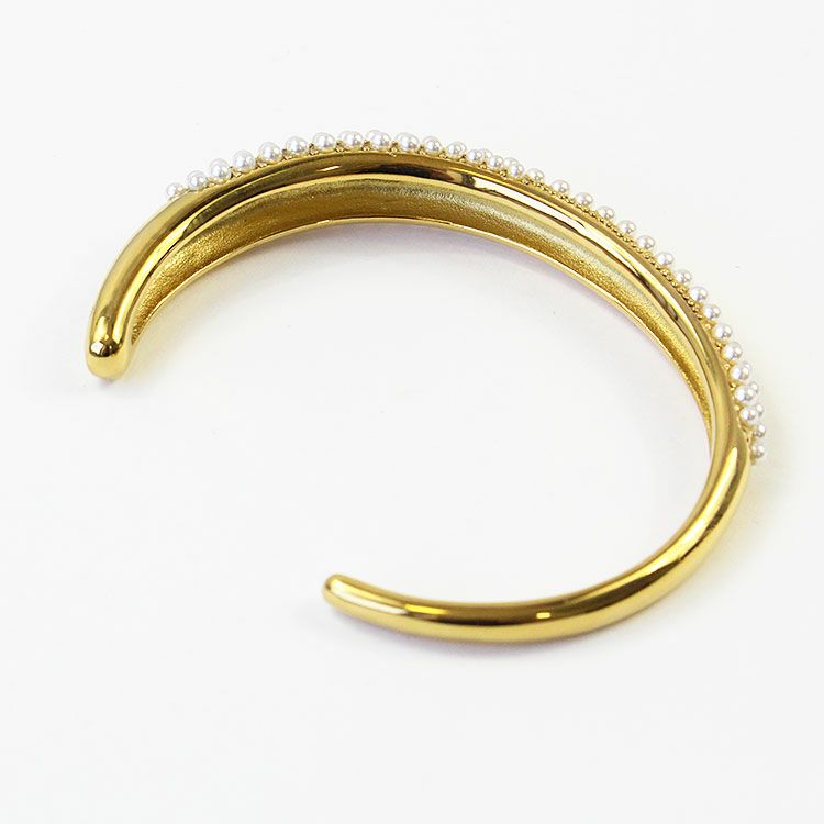 緩やかに幅が変わるアシンメトリーなオープンバングル。ケシパール(樹脂パール)を敷きつめたエレガントで華やかで着脱しやすいデザインです。パーティーシーンはもちろん、あえてカジュアルな装いにご使用いただくことでコーディネートを引き締め、大人カジュアルにご利用いただけます。