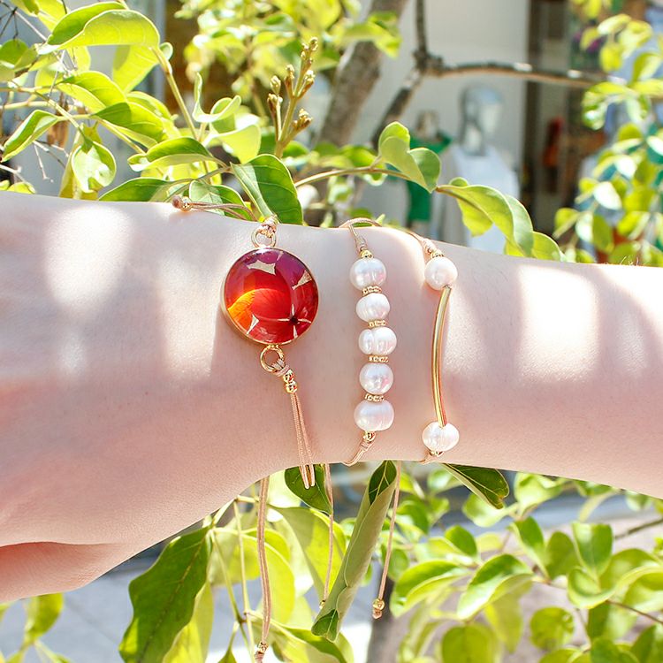 素材:アジサイの花(染め)、レジン、淡水パール、合金、24Kメッキ(グリーン、レッドのみ)