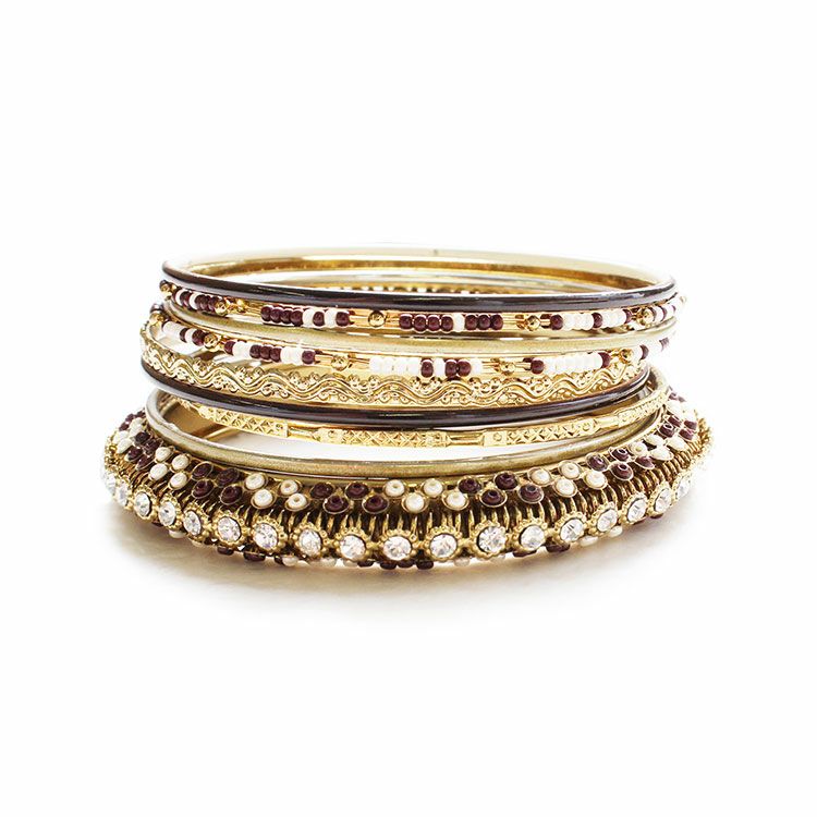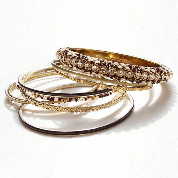 様々なデザインがセットになった多連バングル。それぞれが独立しているので、コーディネートに合わせて数本のみ使用したり、配置を変えたりしてご着用いただけます。