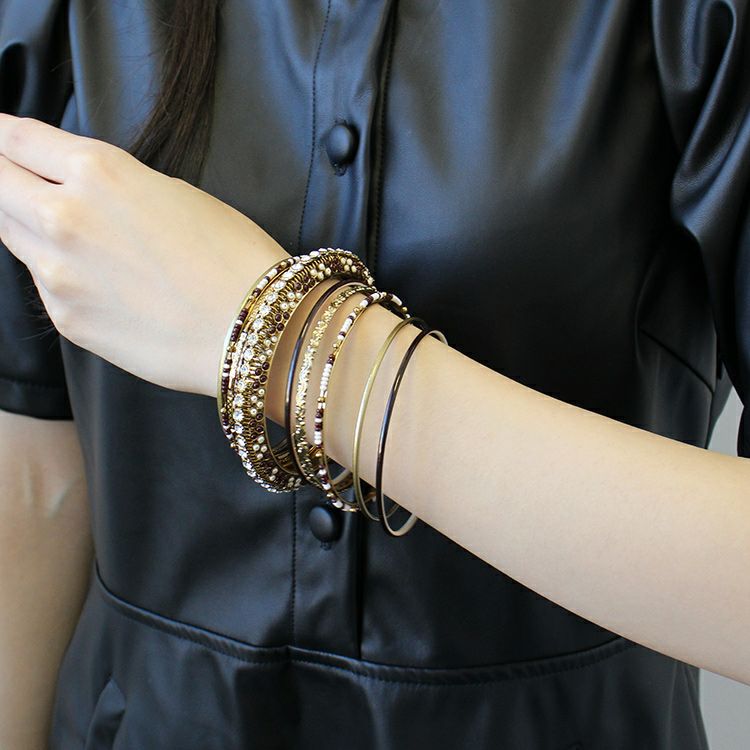 様々なデザインがセットになった多連バングル。それぞれが独立しているので、コーディネートに合わせて数本のみ使用したり、配置を変えたりしてご着用いただけます。