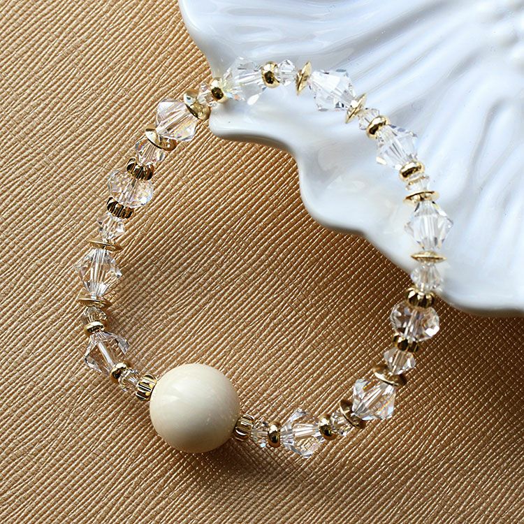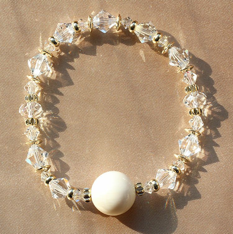約3万年前の氷河期に生息していたマンモスの牙を使用したブレスレット。ボール状に加工したマンモスのパーツに、マンモスが生きた氷河期をイメージして、クリスタルガラスのビーズをあしらったデザインです。着脱しやすいゴム式です。