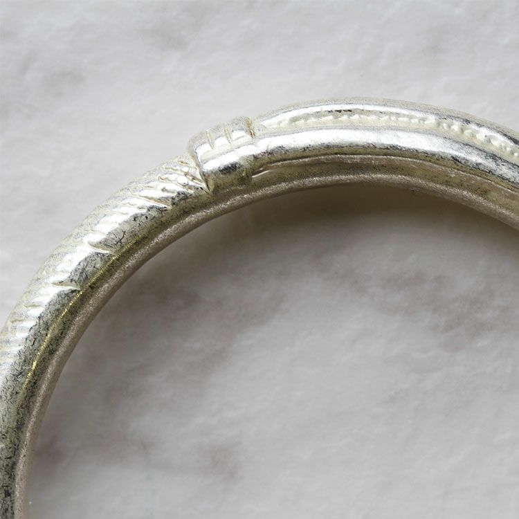 爽やかなホワイトのフラワーが目を惹く細身のバングル。シャンパンゴールド寄りのシルバー部分はアンティーク加工を施したメタルのようなデザインながらアクリル製。軽い付け心地で、ストレスなく重ね付けも楽しめます。ロンデルにあしらわれたクリスタルガラスの輝きもアクセントに。