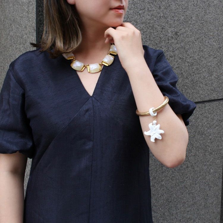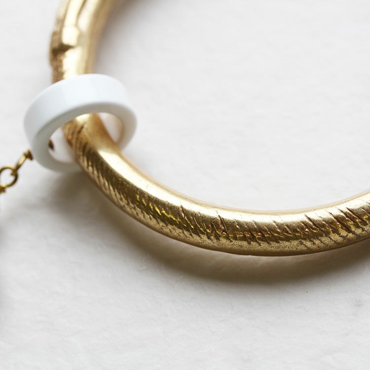 爽やかなホワイトのフラワーが目を惹く細身のバングル。イエローゴールドの部分はアンティーク加工を施したメタルのようなデザインながらアクリル製。軽い付け心地で、ストレスなく重ね付けも楽しめます。ロンデルにあしらわれたクリスタルガラスの輝きもアクセントに。