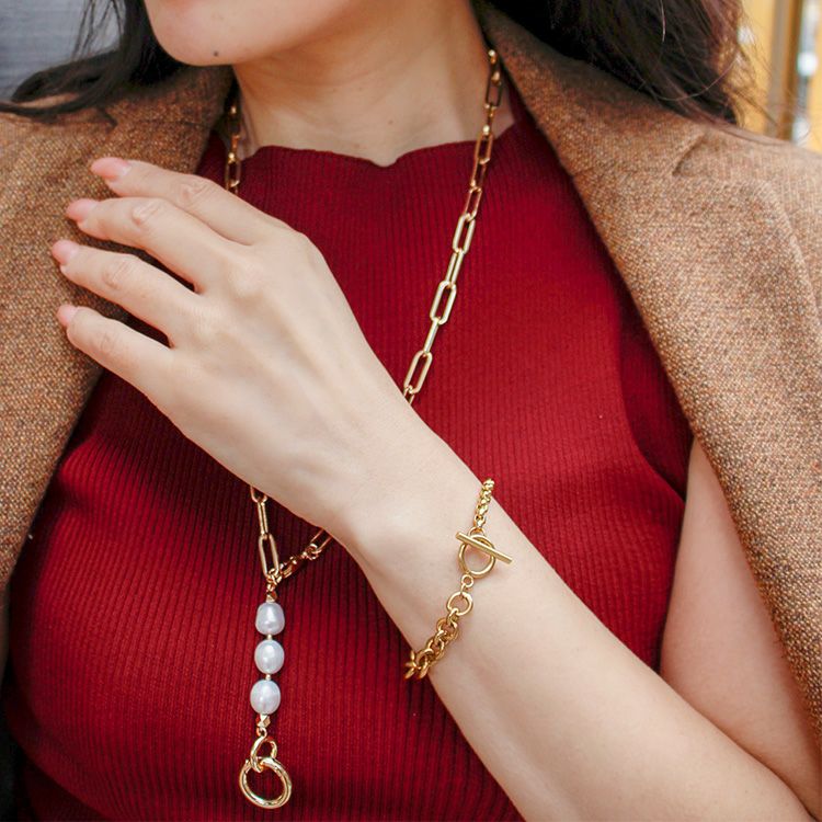 トグルバーがアクセントになり、 セミマットな18Kメッキはカジュアルシーンに合わせやすく、お手元の華やかさを演出いたします。