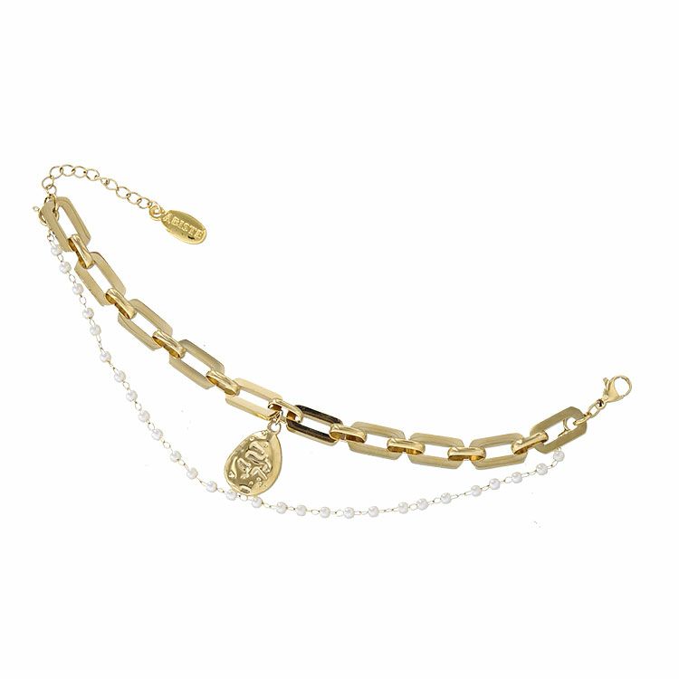 ステンレス製のチェーンデザインブレスレット。小粒のパールブレスレットと重ね付けをしているような、旬のレイヤードデザイン。