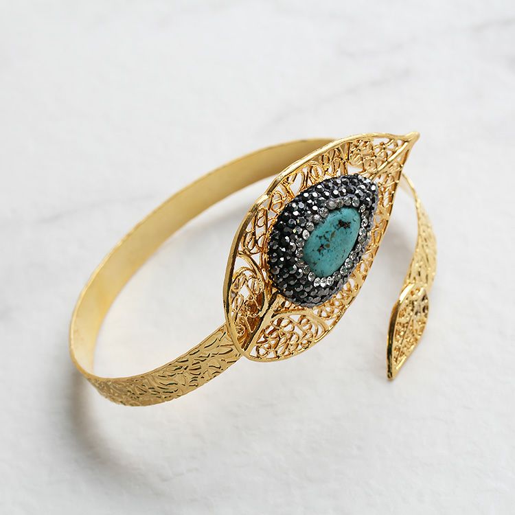 繊細なメタルで形作られたリーフモチーフに、爽やかなブルーのターコイズとクリスタルガラスが輝くバングルとリングのセット。