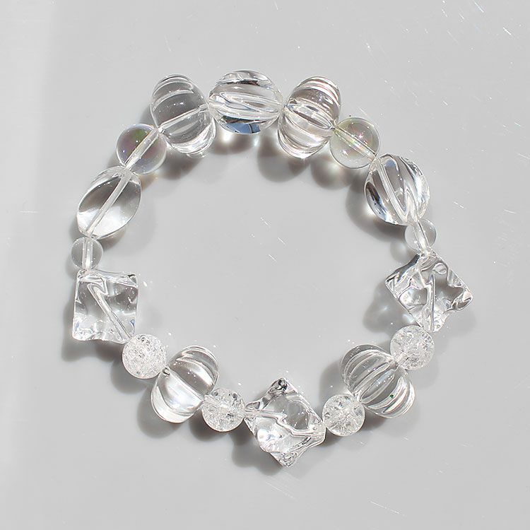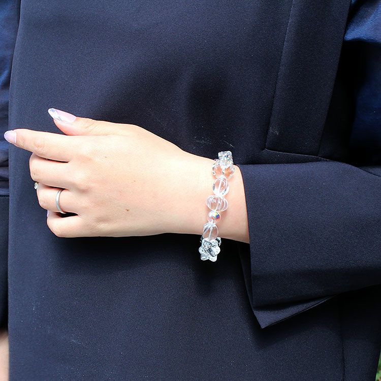 様々な形にカットされたロック・クリスタル(本水晶)に、表面に虹彩被膜処理を行ったクォーツ、クラック処理した白色(半透明色)のクラックルド・クォーツがバランスよく配置さ、デザイン性を高めています。