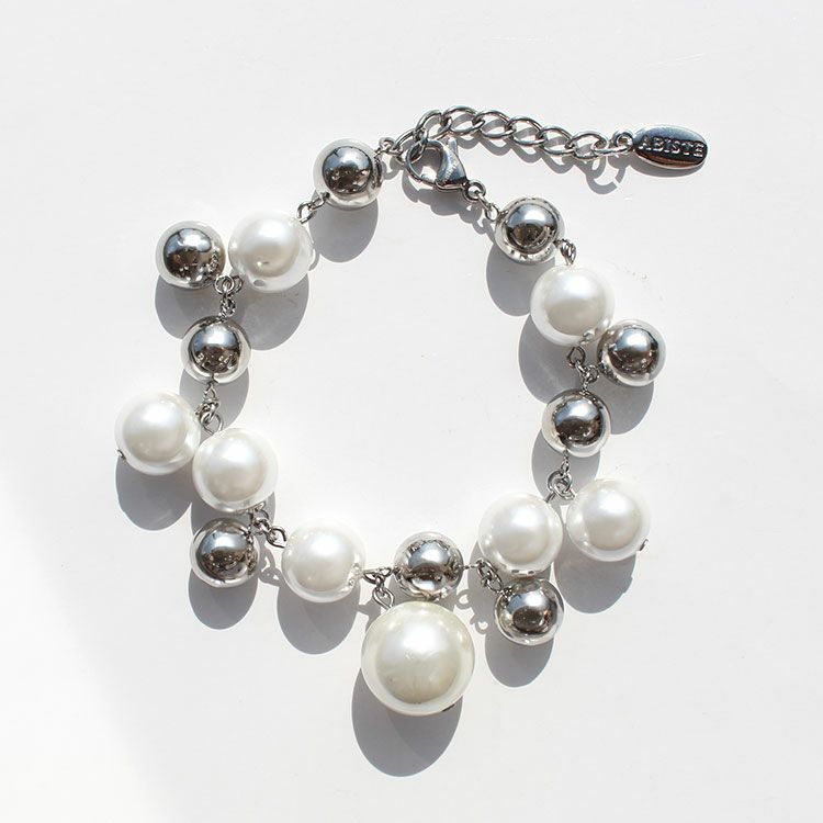 大小パールボールとメタルボールがランダムに組み合わさったブレスレット。大ぶりで存在感があるおしゃれなデザインは、洗練されたスタイリッシュな印象。女子会やお買い物はもちろん、パーティーシーンにもおすすめです。