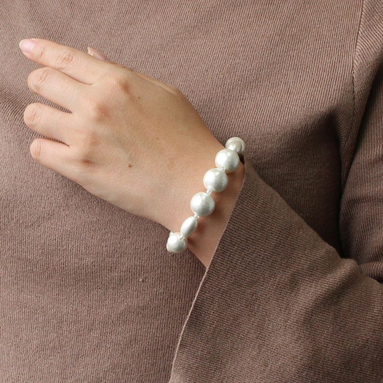 やさしげな肌触りと独特の風合いが魅力の、コットンパールのブレスレット。ゴム式のため着脱もスムーズ。パーティーからデイリーまで幅広くご使用いただけます。