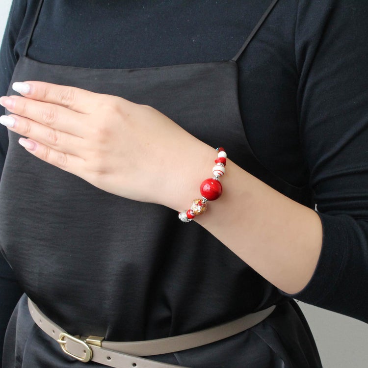 ブルーのブレスレットには、細長いペスタッチョビーズをメインに多彩なビーズを使用。 レッドのブレスレットには、1つのビーズに金銀箔を贅沢にあしらったビーズと細長いペスタッチョビーズをメインに仕上げています。