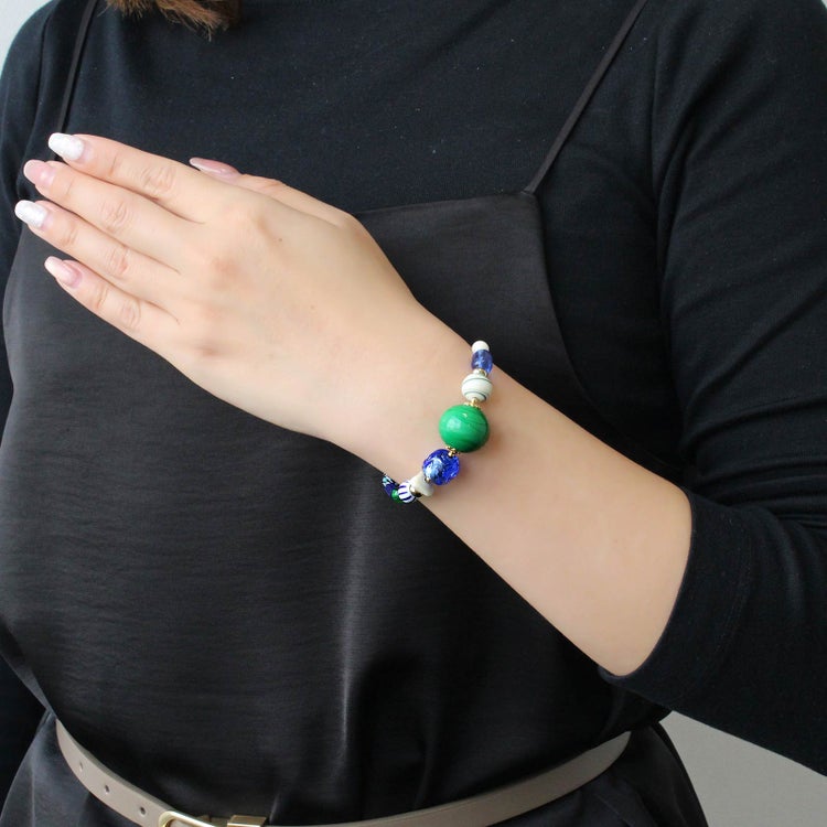1つのブレスの中に、異なるビーズを組み合わせて配置したデザインブレスレット。