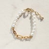 世界一の人工パールといわれるスペイン、マヨルカ島で生産されるマジョルカパールを18金メッキのデザインチェーンと組み合わせたブレスレット。