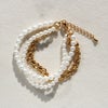 世界一の人工パールといわれるスペイン、マヨルカ島で生産されるマジョルカパールを18金メッキのデザインチェーンと組み合わせたブレスレット。華やかな三連かつシーンを選ばないデザインです。