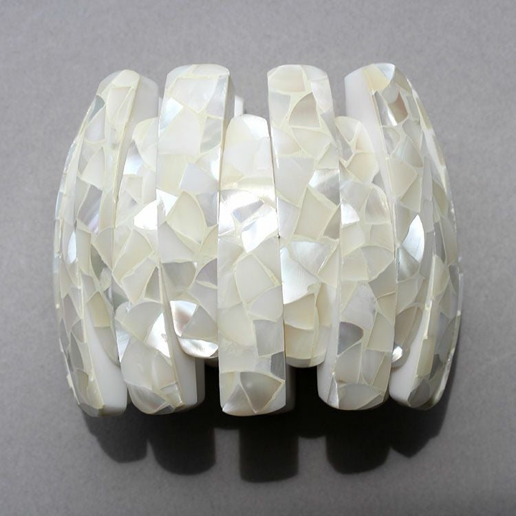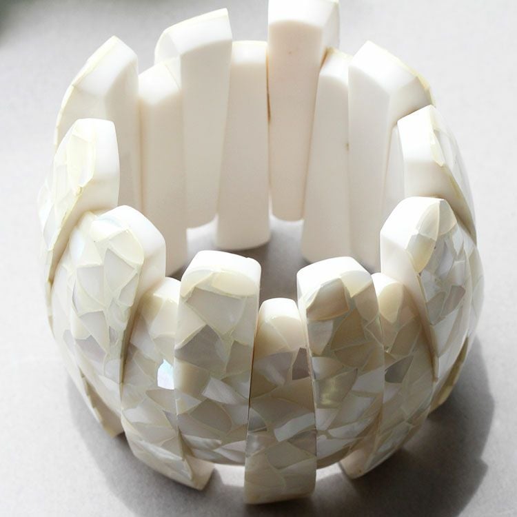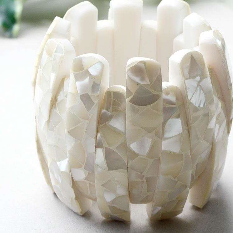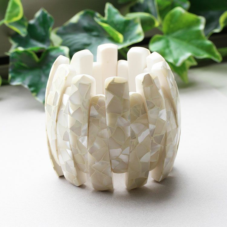 シェル模様が美しい大ぶりのブレスレット。ゴム仕様のため着脱もスムーズ。コーディネートのアクセントに抜群の存在感を演出します。